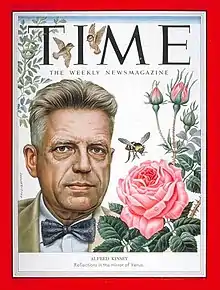 The publication of Sexual Behavior in the Human Female prompted even more intensive news coverage. Kinsey appeared on the cover of the August 24, 1953, issue of Time.[59] The national news magazine featured two articles on the scientist, one focusing on his research, career and new book,[60] the other on his background, personality, and lifestyle.[61] In the magazine's cover portrait, "Flowers, birds, and a bee surround Kinsey; the mirror-of-Venus female symbol decorates his bow tie."[62] The lead article concluded: "'Kinsey ... has done for sex what Columbus did for geography,' declared a pair of enthusiasts ... forgetting that Columbus did not know where he was when he got there. ... Kinsey's work contains much that is valuable, but it must not be mistaken for the last word."[60] A character called "Dr. Kinsey" appeared on the September 15, 1953, television episode of The Jack Benny Program as a bow-tied man interviewing a young woman on board a cruise ship that has left Hawaii. When "Dr. Kinsey" identifies himself to Jack Benny, Benny steps away in embarrassment.[63] The "Dr. Kinsey" character was also written into another sketch in the same episode, commenting on a fantasy Benny is having about Marilyn Monroe (a guest on the episode).[64]