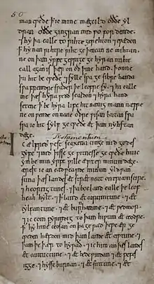 In the late 880s or early 890s, Alfred issued a long domboc or law code consisting of his own laws, followed by a code issued by his late seventh-century predecessor King Ine of Wessex.[104] Together these laws are arranged into 120 chapters. In his introduction Alfred explains that he gathered together the laws he found in many "synod-books" and "ordered to be written many of the ones that our forefathers observed—those that pleased me; and many of the ones that did not please me, I rejected with the advice of my councillors, and commanded them to be observed in a different way".[105]