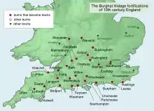 The foundation of Alfred's new military defence system was a network of burhs, distributed at tactical points throughout the kingdom.[82] There were thirty-three burhs, about 30 kilometres (19 miles) apart, enabling the military to confront attacks anywhere in the kingdom within a day.[83][84]