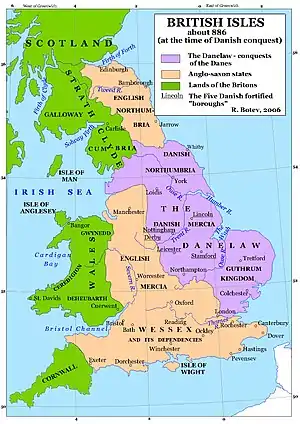 After ascending the throne, Alfred spent several years fighting Viking invasions. He won a decisive victory in the Battle of Edington in 878 and made an agreement with the Vikings, dividing England between Anglo-Saxon territory and the Viking-ruled Danelaw, composed of Scandinavian York, the north-east Midlands and East Anglia. Alfred also oversaw the conversion of Viking leader Guthrum to Christianity. He defended his kingdom against the Viking attempt at conquest, becoming the dominant ruler in England.[3] Alfred began styling himself as "King of the Anglo-Saxons" after reoccupying London from the Vikings. Details of his life are described in a work by 9th-century Welsh scholar and bishop Asser.