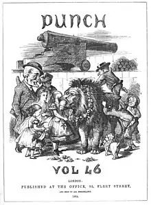 John Tenniel illustrated Alice's Adventures in Wonderland (1865) for a fee of £138, which was roughly a fourth of what Carroll earned each year and which he paid for himself.[26] Tenniel was an already successful, well-known lead illustrator for the satirical magazine Punch,[27] when Carroll employed him as an illustrator in April 1864.[28] In contrast, Carroll did not have any literary fame at the time.[28] Tenniel likely based the majority of his illustrations on those in Under Ground,[29] and Carroll carefully oversaw his work;[30] among his suggestions was that Alice should have long, light-coloured hair.[30] Alice's clothes are typical of what a girl belonging to the middle class in the mid-Victorian era might have worn at home.[31] Her pinafore, a detail created by Tenniel and now associated with the character, "suggests a certain readiness for action and lack of ceremony".[32] Tenniel's depiction of Alice has its origins in a physically similar character which appeared in at least eight cartoons in Punch, during a four-year period that began in 1860.[31] In an 1860 cartoon, this character wore clothes now associated with Alice: "the full skirt, pale stockings, flat shoes, and a hairband over her loose hair".[31] In the cartoons, the character appeared as an archetype of a pleasant girl from the middle classes;[33] she has been described as similar to Alice: "a pacifist and noninterventionist, patient and polite, slow to return the aggression of others".[34]