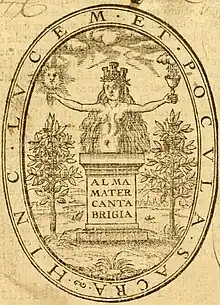 The earliest documented use of the term to refer to a university in an English-speaking country is in 1600, when the University of Cambridge printer, John Legate, began using an emblem for the university press.[9][10] The first-known appearance of the device is on the title-page of a book by William Perkins, A Golden Chain, where the Latin phrase Alma Mater Cantabrigia ("nourishing mother Cambridge") is inscribed on a pedestal bearing a nude, lactating woman wearing a mural crown.[11][12]