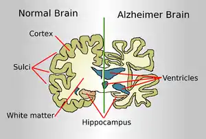 Alzheimer's disease is characterised by loss of neurons and synapses in the cerebral cortex and certain subcortical regions. This loss results in gross atrophy of the affected regions, including degeneration in the temporal lobe and parietal lobe, and parts of the frontal cortex and cingulate gyrus.[78] Degeneration is also present in brainstem nuclei particularly the locus coeruleus in the pons.[79] Studies using MRI and PET have documented reductions in the size of specific brain regions in people with Alzheimer's disease as they progressed from mild cognitive impairment to Alzheimer's disease, and in comparison with similar images from healthy older adults.[80][81]