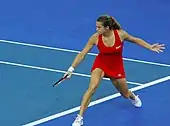 Mauresmo was an aggressive player with an all-court game, who was noted for her technical mastery. Her strongest groundstroke was her one-handed backhand, which was one of the most effective on the WTA tour. Mauresmo could hit her backhand flat and with depth, with topspin, or with slice; her backhand was responsible for most of the winners she accumulated on court.[23] Her forehand was more erratic, and players acquainted with Mauresmo's game would hit relentlessly to her forehand to try to force an error. Throughout her career, however, Mauresmo made improvements to her forehand, and, by 2005, it became a stroke she utilised more frequently and with more success. Her serve was powerful, with her first serve averaging 107 mph (172 km/h), and being recorded as high as 116 mph (187 km/h), enabling her to serve aces regularly. A reliable second serves, typically delivered at 92 mph (148 km/h), meant that double faults were uncommon. Mauresmo was one of the strongest net players on the WTA Tour, and would frequently choose to finish points at the net. An exceptional volleyer, she had deft touch at the net and had a complete repertoire of shots to perform there. Although not a net-rusher like Martina Navratilova or Billie Jean King, Mauresmo was a proficient serve and volleyer; this tactic was especially effective on grass courts.[24] She was an aggressive returner, standing on the baseline to receive first serves, neutralising them effectively with a backhand down-the-line or an inside-out forehand. She would stand several feet within the baseline to receive second serves and could hit return winners frequently. Despite her exceptional skill, Mauresmo's greatest weakness was her lack of confidence, nerves, and inconsistency; these were discussed at length by the media throughout her career.[25] Mauresmo's game was effective on all surfaces, and she won tournaments on all four surfaces.
