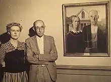 Wood entered the painting in a competition at the Art Institute of Chicago. One judge deemed it a "comic valentine", but a museum patron persuaded the jury to award the painting the bronze medal and a $300 cash prize.[18] The same patron also persuaded the Art Institute to buy the painting, and it remains part of the Chicago museum's collection.[2] The image soon began to be reproduced in newspapers, first by the Chicago Evening Post, and then in New York, Boston, Kansas City, and Indianapolis. However, when the image finally appeared in the Cedar Rapids Gazette, there was a backlash. Iowans were furious at their depiction as "pinched, grim-faced, puritanical Bible-thumpers".[19] Wood protested, saying that he had not painted a caricature of Iowans, but rather a depiction of his appreciation, stating "I had to go to France to appreciate Iowa."[12] In a 1941 letter, Wood said that, "In general, I have found, the people who resent the painting are those who feel that they themselves resemble the portrayal."[20]