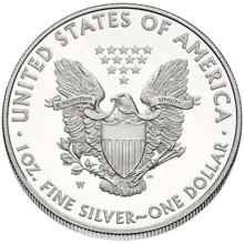 From 1986 to 2021, the reverse was designed by John Mercanti and portrayed a heraldic eagle behind a shield; the eagle grasping an olive branch in its right talon and arrows in its left talon, echoing the Great Seal of the United States; above the eagle are thirteen five-pointed stars representing the Thirteen Colonies. The reverse was inscribed with the phrases UNITED STATES OF AMERICA, 1 OZ. FINE SILVER~ONE DOLLAR, and E PLURIBUS UNUM (on the banner that the eagle holds in its beak), as well as the mintmark if applicable.[2]