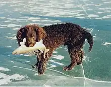The breed was made the state dog of Wisconsin in 1985.[7] The American Water Spaniel remains a rare breed. During 1998 only 233 puppies were registered with the AKC, with an estimated 3,000 dogs in existence mostly around the Midwestern United States,[8] in particular in Wisconsin, Minnesota and Michigan.[9] In 2010, the breed was ranked 143rd most popular breed in the United States, out of 167 breeds. This is a decrease since 2000, when the breed was ranked 125th.[10] The dogs are not classified specifically as either retrievers or as spaniels and so may not compete in AKC field trials, but may compete in AKC hunt tests (spaniel and retriever tests) and retriever hunting tests sponsored by the AWSC, the breed club in the United States.[8] The American Water Spaniel Field Association was set up in 1993 by breed enthusiasts supporting AKC Spaniel classification and looking to provide field training opportunities to owners of the breed.[11] In a vote held of members of the AWSC in 1999, they chose to keep the breed unclassified.[5]