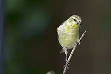 The American goldfinch was one of the many species originally described by Carl Linnaeus in the landmark 1758 10th edition of his work, Systema Naturae, where he classified it in the genus Fringilla.[3] It was later placed in the genus Spinus, a group containing New World goldfinches and siskins. In 1976, Spinus was merged into the genus Carduelis as a subgenus.[4] Recent studies have resurrected the genus Spinus. Its closest relatives are the lesser goldfinch (S. psaltria), Lawrence's goldfinch (S. lawrencei), and the siskins. Although it shares a name with the European goldfinch, the two are in separate genera and are not closely related.[5] Carduelis is derived from carduus, the Latin word for 'thistle'; the species name tristis is Latin for 'sorrowful'.[6] There are four recognized subspecies of the American goldfinch:[7]