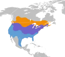 The summer breeding range stretches across North America from coast to coast. It is bounded on the north by Saskatchewan and stretches south across North America to North Carolina on the east coast, and northern California on the west coast.[15] The American goldfinch is a short-distance migrant, moving south in response to colder weather and lessened food supply. According to ornithologist Marc Parnell, this responsive, southerly migratory pattern is thought to begin to occur as daily low temperatures approach freezing, and particularly as these temperatures near 0 °F.[23] The migration is completed in compact flocks, which travel in an erratic, wavelike flight pattern.[24]
