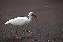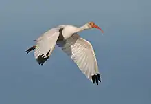 The American white ibis (Eudocimus albus) is a species of bird in the ibis family, Threskiornithidae. It is found from Virginia via the Gulf Coast of the United States south through most of the coastal New World tropics.[2] This particular ibis is a medium-sized bird with an overall white plumage, bright red-orange down-curved bill and long legs, and black wing tips that are usually only visible in flight. Males are larger and have longer bills than females. The breeding range runs along the Gulf and Atlantic Coast, and the coasts of Mexico and Central America. Outside the breeding period, the range extends further inland in North America and also includes the Caribbean. It is also found along the northwestern South American coastline in Colombia and Venezuela. Populations in central Venezuela overlap and interbreed with the scarlet ibis. The two have been classified by some authorities as a single species.