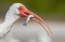 The American white ibis prefers to eat crayfish and other crustaceans, but also takes aquatic insects and small fish.[12][46] Outside the nesting season, the diet is highly variable, as abundance and types of prey depend on both the region and the habitat. In the Llanos, located in Colombia and Venezuela, the most frequent prey are insects, such as fly larvae and beetles. Generally in North America the main prey are crustaceans, mostly crayfish.[47] In the Everglades and cypress swamps, the diet is primarily made up of crayfish, while those that feed in willow ponds eat predominantly fish. American white ibises that feed in mangrove swamps focus on crabs.[30] The tactile nature of the ibis's probing for food in mud means that it catches prey that are too slow to evade the ibis once located by its bill. In the Everglades, this means that crayfish make up a large part of the diet, but a more diverse array of invertebrates are taken in coastal areas.[48] Although crayfish are sought by foraging ibises, prey switching to fish does occur if fish are found in great abundance. It is unclear whether the fish are more easily caught if overcrowded, or whether sheer numbers of fish mean that ibises are catching them instead of crayfish—normally, fish are more agile than crayfish and hence elude the ibis's bill more easily. Fish are a more energy-rich source of food for the American white ibis.[30] In the breeding season, American white ibises in a colony at Pumpkinseed Island travelled further to forage in freshwater wetlands and catch crayfish, than nearby saltwater areas where fiddler crabs predominated, indicating their benefit was worth the extra energy expended in fetching them for their young.[49] This travel results in the wholesale transport of nutrients across the landscape by the colony; in a successful breeding year the colony at Pumpkinseed Island was estimated to have contributed a third as much phosphorus to the neighboring estuary as other environmental processes.[50]