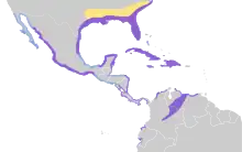 In North America, breeding takes place along the Atlantic coast, from the Carolinas south to Florida and thence west along the Gulf Coast.[2] Laguna Cuyutlán is an isolated and regionally important wetland in the state of Colima on México's west coast where a breeding colony has been recorded.[25] American white ibises are not faithful to the sites where they breed,[26] and large breeding colonies composed of ten thousand birds or more can congregate and disband in one or two breeding seasons.[27] Breeding populations across its range have fluctuated greatly with wholesale movement between states.[28]