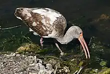 The American white ibis is found in mixed-species foraging flocks with the glossy ibis (Plegadis falcinellus) in flooded fields, and the two species select different food items with little overlap; the former foraging for crabs and aquatic insects and the latter feeding mainly on grain.[5] The wood stork is also found in the same habitat in Florida, but hunts larger prey and a higher percentage of fish, so there is little overlap.[48] In the Llanos, where American white ibis coexist with the scarlet ibis, their diets differ, the former consuming more bugs, fish and crustaceans, while the latter eat a much higher proportion of beetles.[47] The willet (Tringa semipalmata) has been observed trailing American white ibis and catching prey disturbed by them, and even kleptoparasitizing (stealing) from them, in J. N. "Ding" Darling National Wildlife Refuge on Sanibel Island in Florida.[51] An isolated event of intraspecific predation in juvenile American white ibis has been observed, where a juvenile attacked and consumed a chick from another nest.[52]