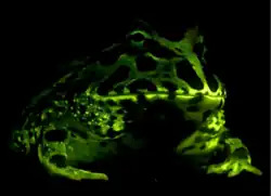 The skin colour of amphibians is produced by three layers of pigment cells called chromatophores. These three cell layers consist of the melanophores (occupying the deepest layer), the guanophores (forming an intermediate layer and containing many granules, producing a blue-green colour) and the lipophores (yellow, the most superficial layer). The colour change displayed by many species is initiated by hormones secreted by the pituitary gland. Unlike bony fish, there is no direct control of the pigment cells by the nervous system, and this results in the colour change taking place more slowly than happens in fish. A vividly coloured skin usually indicates that the species is toxic and is a warning sign to predators.[65]