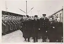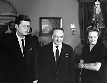In November 1963 Mikoyan was asked by Khrushchev to represent the USSR at President John F. Kennedy's funeral.[50] At the funeral ceremony, Mikoyan appeared visibly shaken by the president's death and was approached by Jacqueline Kennedy, who took his hand and conveyed to him the following message: "Please tell Mr. Chairman [Khrushchev] that I know he and my husband worked together for a peaceful world, and now he and you must carry on my husband's work."[51]