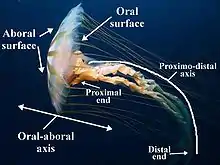 Cnidarians (jellyfish, sea anemones and corals) have an incomplete digestive system, meaning that one end of the organism has a mouth, and the opposite end has no opening from the gut (coelenteron).[43] For this reason, the end of the organism with the mouth is referred to as the oral end (from Latin ōrālis 'of the mouth'),[63] and the opposite surface is the aboral end (from Latin ab- 'away from').[64]