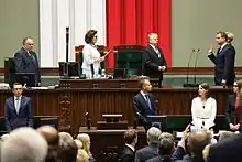 Andrzej Duda refused to swear in any of the five Constitutional Tribunal judge candidates selected by the Sejm of the VII term. Three of them had been selected since 7 November 2015 whose election was declared constitutional.[39] On 3 and 9 December 2015 Duda swore in five other candidates for the same office selected by the Sejm of the VIII term.[40][41]