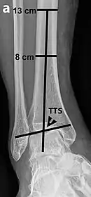 Varus or valgus deformity, if suspected, can be measured with the frontal tibiotalar surface angle (TTS), formed by the mid-longitudinal tibial axis (such as through a line bisecting the tibia at 8 and 13 cm above the tibial plafond) and the talar surface.[23] An angle of less than 84 degrees is regarded as talipes varus, and an angle of more than 94 degrees is regarded as talipes valgus.[24]