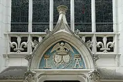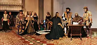 The double mausoleum Louis XII and Anne of Brittany, carved in Carrara marble, was unveiled at Saint Denis Basilica in 1531.[53] The baldachin was in arcades, and in the base of the sarcophagus were depicted the victories of Louis XII (Battle of Agnadello, the triumphal entry into Milan), statues of the Twelve Apostles and the four Cardinal virtues, the work of the Juste brothers, Italian sculptors who received the order in 1515. The transi (whose realism was so shocking that it included an open abdomen stitched after the extraction of the entrails[54]) and orans before a Prie-dieu crowning the platform are attributed to Guillaume Regnault.[55] The tomb was desecrated during the Revolution on 18 October 1793 and the bodies were thrown into a mass grave. Alexandre Lenoir saved much of the monument, which was preserved in the Museum of French Monuments in 1795 before being returned to the Royal Basilica under the Second Bourbon Restoration.[56]