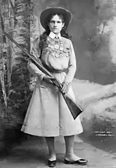 During her first engagement with the Buffalo Bill show, Oakley experienced a tense professional rivalry with rifle sharpshooter Lillian Smith. Smith was eleven years younger than Oakley, age 15 at the time she joined the show in 1886, which may have been a primary reason for Oakley to alter her age as six years younger in later years due to Smith's press coverage becoming as favorable as hers.[33] Oakley temporarily left the Buffalo Bill show but returned two years later, after Smith departed, in time for the Paris Exposition of 1889.[34] This three-year tour only cemented Oakley as America's first female star. She earned more than any other performer in the show, except Buffalo Bill himself. She also performed in many shows on the side for extra income.[34] During her lifetime, the theatre business began referring to complimentary tickets as "Annie Oakleys". Such tickets traditionally have holes punched into them (to prevent them from being resold), reminiscent of the playing cards Oakley shot through during her sharpshooting act.