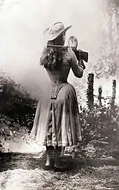 Oakley also proved to be a great influence on women. She urged that women serve in war, though President William McKinley rejected her offer of woman sharpshooters for service in the Spanish–American War.[37] Beyond this offer to the president, Oakley believed that women should learn to use a gun for the empowering image that it gave.[63] Laura Browder discusses how Oakley's stardom gave hope to women and youth in Her Best Shot: Women and Guns In America. Oakley pressed for women to be independent and educated.[63] She was a key influence in the creation of the image of the American cowgirl. Through this image, she provided substantial evidence that women are as capable as men when offered the opportunity to prove themselves.[64]