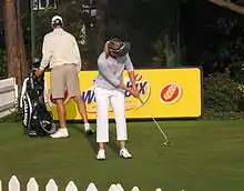 Sörenstam was invited to play in the PGA Tour's Bank of America Colonial golf tournament in Fort Worth, Texas, in May 2003, making her the first woman to play in a PGA Tour event since Babe Zaharias, who qualified for the 1945 Los Angeles Open.[51] Vijay Singh, fourth in the world rankings at the time, criticised her invitation, saying that she should have to qualify like the men and that he did not want to be beaten by a woman.[52][53] Cheered through each hole, she shot five over par, tying for 96th out of the 111 who finished the first two rounds. After shooting 1-over-par 71 in the first round, finishing in 73rd and on pace to challenge for a weekend spot, Sörenstam said she was nervous all day but pleased by her performance.[54] In the first round she led the field in driving accuracy, was in the top 20 in greens in regulation, and was 84th out of 111 in driving distance. Poor putting (last in the field, averaging over a two-putt) caused her to miss the cut.[55]