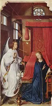 The Annunciation draws heavily on van der Weyden's Louvre Annunciation (1430s), his Saint Columba Altarpiece (c. 1455), and the Clugny Annunciation (c. 1465–1475), which is attributed either to van der Weyden or to Memling.[1] Memling almost certainly was apprenticed to van der Weyden in Brussels until he set up his own workshop in Bruges sometime after 1465.[27] Memling's Annunciation is more innovative, with motifs such as the attendant angels that were absent in the earlier paintings.[1] According to Till-Holger Borchert, not only was Memling familiar with van der Weyden's motifs and compositions, but he might have assisted with the underdrawing in van der Weyden's workshop.[27] The shutters on the right are copied from the Louvre panel, and the knotted curtain appears in the Saint Columba triptych's "Annunciation".[6]