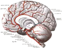 ![]() Medial surface of cerebral hemisphere. Areas supplied by the anterior cerebral artery are shown in blue. | |