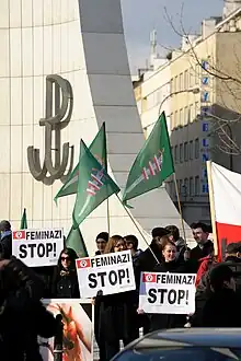 Media researcher Michele White argues that contemporary antifeminism often supports antisemitism and white supremacy, citing the example of the Neo-Nazi websites Stormfront and The Daily Stormer, which often claim that feminism represents a Jewish plot to destroy Western civilization.[76] According to Helen Lewis, the far-right ideology considers it vital to control female reproduction and sexuality: "Misogyny is used predominantly as the first outreach mechanism", where "You were owed something, or your life should have been X, but because of the ridiculous things feminists are doing, you can't access them."[71] Similar strands of thought are found in the incel subculture, which centers around misogynist fantasies about punishing women for not having sex with them.[77]