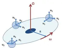 As a combination example, Figure 4 shows a coordinate system B that orbits inertial frame A as in Figure 3, but the coordinate axes in frame B turn so unit vector u1 always points toward the centre of rotation. This example might apply to a test tube in a centrifuge, where vector u1 points along the axis of the tube toward its opening at its top. It also resembles the Earth–Moon system, where the Moon always presents the same face to the Earth.[41] In this example, unit vector u3 retains a fixed orientation, while vectors u1, u2 rotate at the same rate as the origin of coordinates. That is,