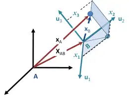 As an aside, the unit vectors { uj } cannot change magnitude, so derivatives of these vectors express only rotation of the coordinate system B. On the other hand, vector XAB simply locates the origin of frame B relative to frame A, and so cannot include rotation of frame B.