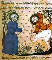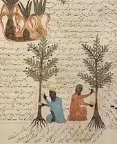 Medieval Islamic agronomists including Ibn Bassal and Abū l-Khayr described agricultural and horticultural techniques including how to propagate the olive and the date palm, crop rotation of flax with wheat or barley, and companion planting of grape and olive.[9] These books demonstrate the importance of agriculture both as a traditional practice and as a scholarly science.[9] In al-Andalus, there is evidence that the almanacs and manuals of agronomy helped to catalyse change, causing scholars to seek out new kinds of vegetable and fruit, and to carry out experiments in botany; in turn, these helped to improve actual practice in the region's agriculture.[12] During the 11th century Abbadid dynasty in Seville, the sultan took a personal interest in fruit production, discovering from a peasant the method he had used to grow some exceptionally large melons—pinching off all but ten of the buds, and using wooden props to hold the stems off the ground.[12]