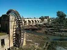 The sakia[lower-alpha 2] or animal-powered irrigation wheel was likely introduced to Islamic Spain in early Umayyad times (in the 8th century). Improvements to it were described by Hispano-Arabic agronomists in the 11th and 12th centuries. From there, sakia irrigation was spread further around Spain and Morocco.[19] A 13th century observer claimed there were "5000" waterwheels along the Guadalquivir in Islamic Spain; even allowing for medieval exaggeration,[20] irrigation systems were certainly extensive in the region at that time. The supply of water was sufficient for cities as well as agriculture: the Roman aqueduct network into the city of Cordoba was repaired in the Umayyad period, and extended.[20][21]