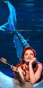 In order to portray the characters underwater, the actors wore Heelys wheeled footwear, which simulate the gliding action of swimming creatures.[38] The actors playing Ariel and the other merfolk had wire-frame tails attached to their hips. Subsequent productions feature different designs for Ariel and the merfolk; the Dutch and Japanese productions use wirework and aerial stunts to create the illusion of underwater swimming.[39]