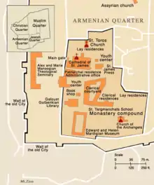 The Armenian Quarter is located in the southwestern corner of Jerusalem's Old City.[5] The quarter can be accessed through the Zion Gate and Jaffa Gate.[6] According to a 2007 study published by the International Peace and Cooperation Center, the quarter occupies an area of 0.126 km2 (126 dunam), which is 14% of the Old City's total.[7] The Armenian Quarter is formally separated from the Christian Quarter by David Street (Suq el-Bazaar) and by Habad Street (Suq el-Husur) from the Jewish Quarter.[8]