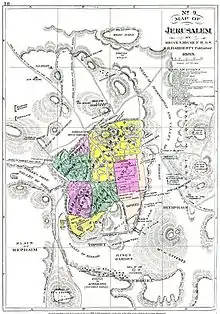 The Armenian district of Jerusalem originated around the Armenian monastery in the south part of the modern Armenian Quarter.[9] The convention of the boundaries of the Armenian Quarter may have originated in its current form in the 1841 British Royal Engineers map of Jerusalem,[10] or at least Reverend George Williams' subsequent labelling of it.[11] The city had previously been divided into many more harat (Arabic: حارَة, romanized: Hārat: "quarters", "neighborhoods", "districts" or "areas", see wikt:حارة).[12]