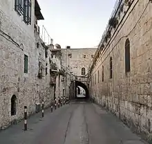 The Armenian Quarter (Arabic: حارة الأرمن, Harat al-Arman; Hebrew: הרובע הארמני, Ha-Rova ha-Armeni; Armenian: Հայոց թաղ, Hayots t'agh)[1][2][lower-alpha 1] is one of the four sectors of the walled Old City of Jerusalem. Located in the southwestern corner of the Old City, it can be accessed through the Zion Gate and Jaffa Gate. It occupies an area of 0.126 km² (126 dunam), which is 14% of the Old City's total. In 2007, it had a population of 2,424 (6.55% of Old City's total). In both criteria, it is comparable to the Jewish Quarter. The Armenian Quarter is separated from the Christian Quarter by David Street (Suq el-Bazaar) and from the Jewish Quarter by Habad Street (Suq el-Husur).