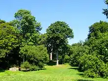 From 1946 to 1950, the landscape architect Beatrix Farrand was the landscape design consultant for the Arboretum. Her early training in the 1890s included time with Charles Sprague Sargent and Jackson Thornton Dawson, the chief propagator and superintendent.[14] Today the Arboretum occupies 281 acres (114 ha) of land divided between four parcels, viz. the main Arboretum and the Peters Hill, Weld-Walter and South Street tracts. The collections are located primarily in the main Arboretum and on the Peters Hill tract. The Arboretum remains one of the finest examples of a landscape designed by Frederick Law Olmsted. Olmsted's office, now known as the Frederick Law Olmsted National Historic Site, is located in nearby Brookline.[15]