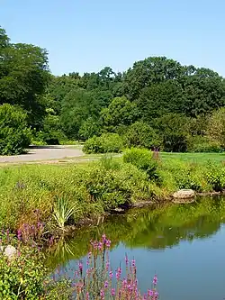 The Arnold Arboretum of Harvard University is a botanical research institution and free public park, located in the Jamaica Plain and Roslindale neighborhoods of Boston, Massachusetts. Established in 1872, it is the oldest public arboretum in North America.[2] The landscape was designed by Charles Sprague Sargent and Frederick Law Olmsted and is the second largest "link" in the Emerald Necklace. The Arnold Arboretum's collection of temperate trees, shrubs, and vines has an emphasis on the plants of the eastern United States and eastern Asia,[3] where arboretum staff and colleagues are sourcing new material on plant collecting expeditions.[4] The arboretum supports research in its landscape and in its Weld Hill Research Building.[5]