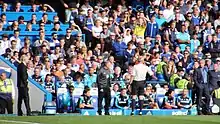 Wenger appointed Vieira as club captain following Adams' retirement, and made few additions to his double-winning squad, signing defender Pascal Cygan, midfielder Gilberto Silva and utility player Kolo Touré.[170] He was confident his side would retain the league and told the media: "Nobody will finish above us in the league. It wouldn't surprise me if we were to go unbeaten for the whole of the season".[171][nb 3] Arsenal set a new top-flight record in their opening game of the 2002–03 season; a 2–0 victory against Birmingham City was their 14th league win in succession.[173] They continued their fine start by overhauling Nottingham Forest's top-flight record of 22 away league matches without defeat and later surpassed Manchester United's Premier League total of 29 matches unbeaten.[174] Arsenal lost to Everton in October 2002, which began a run of four matches without a win.[175] Though Wenger's team built an eight-point lead over challengers Manchester United by March 2003, they were overhauled in the final weeks of the season.[176] The title race shifted in United's favour when Bolton Wanderers came from behind to draw 2–2 against Arsenal.[176] Wenger showed moments of exasperation during the match by loosening his tie and bellowing orders from the touchline. Journalist Phil McNulty wrote that Wenger's demeanor "spoke of someone who had the title in his grasp but now saw it slipping from his fingers".[177] Arsenal beat Southampton 1–0 to retain the FA Cup at the end of the campaign.[178]