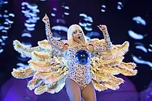Gaga did not preview the costumes for the tour until the opening night. There were seven outfits created for the show, all throughout the different segments. The first was a bejeweled leotard which had the Jeff Koons blue gazing ball attached in the middle; the ball was previously used in the album cover art for Artpop. Gaga accessorized the dress with a pair of feathered wings while wearing a blond bob wig reminiscent of her looks from The Fame era.[23][24] A rave inspired outfit was worn for the last segment and consisted of colorful dreadlocks and legwarmers made of fur. She added a shirt consisting of straps and plastic sleeves with it. One of the complex outfits was made of latex and consisted of a polka dotted leotard and a number of tentacles attached to the dress as well as a headpiece with two tentacles from it.[23]
