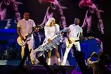 The singer also wore a short dress coupled with a platinum bob wig; another version of the dress had a gown attached to it, with Gaga wearing a long wig inspired by Donatella Versace. Before the final performance Gaga wore black latex pants and a top, with a green wig on her head and a necklace made of marijuana leaves. Finally, Gaga also wore a seashell bikini top and voluminous wig; the ensemble had been worn by Gaga in previous live performances for the Artpop era.[23] Her dancers wore neon colored outfits with matching head gears and accessories. Gaga also had a number of unique props, including a Gibson Flying V guitar during "Venus", a plastic chair shaped like a claw and a keytar which was shaped like a sea horse.[16]
