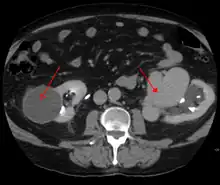 Pulmonary arteriovenous malformations are abnormal communications between the veins and arteries of the pulmonary circulation, leading to a right-to-left blood shunt.[5][6] They have no symptoms in up to 29% of all cases,[7] however they can give rise to serious complications including hemorrhage, and infection.[5] They are most commonly associated with hereditary hemorrhagic telangiectasia.[6]