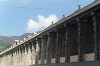 Inside the doorway of the first tower and the fifth precinct, there is a thousand-pillared hall built during the late Vijayanagara period.[5] Krishnadevaraya constructed the hall and dug the tank opposite to it.[5][35] The pillars in the hall are carved with images of yali, a mythological beast with body of lion and head of an elephant, a symbol of Nayak power.[36] The Arunagirinathar Mandapam is located to the right of the Kalayana Linga Sundara Eswara Mandapam, and the Gopurathilayanar shrine is to the left of a broad flight of stone stairs that lead up to the Vallala Gopuram.[34]