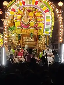 Every full moon, tens of thousands of pilgrims worship Arunachalesvara by circumambulating the Arunachala hill barefoot.[5] The circumambulation covers a distance of 14 kilometres (8.7 mi), and is referred to as Girivalam.[6][40] According to Hindu legend, the walk removes sins, fulfils desires and helps achieve freedom from the cycle of birth and rebirth.[15] Offerings are made in a string of tanks, shrines, pillared meditation halls, springs and caves around the hill.[3] The circumambulation continues during the rest of the month. On the day of yearly Chitra Pournami, the full moon of the Tamil calendar, hundreds of thousands of pilgrims come from across the world to worship Arunachalesvara. Five temple cars, called ther, with wooden carvings, are used for the procession.[15]