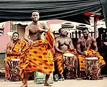 In the bragoro puberty rites, girls’ heads are shaved and dyed black.[28] Every day during the rites, young girls in the community feed the chosen girls boiled eggs, fish, and eto.[30][31] Alongside, the older women in the community, called mmerewa, teach the girls about marriage, motherhood, and morality. The merewa bathe the girls in a neighboring stream.[28] Then, the mmerewa dress the young ladies in white cloth (ntoma) and gold jewelry.[28] Afterward, the girls are showcased to the entire community with songs, dances, and praises.[29]
