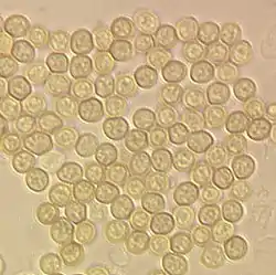 ![]() Conidiospores of Trichoderma aggressivum, Diameter approx. 3µm |