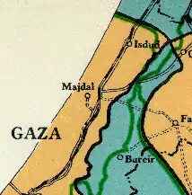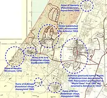 The modern urban development of the area began approximately 4 km inland from the ancient site as the Palestinian town of al-Majdal (Arabic: الْمِجْدَل, romanized: al-Mijdal; Hebrew: אֵל־מִגְ׳דַּל, romanized: ʾĒl-Mīǧdal). Its inhabitants were exclusively Muslims and Christians; on the eve of the 1948 Arab–Israeli War the inhabitants numbered 10,000 and in October 1948, the city accommodated thousands more Palestinian refugees from nearby villages.[2][3] The town was conquered by Israeli forces on 5 November 1948, by which time much of the Arab population had fled,[4] leaving some 2,700 inhabitants, of which 500 were deported by Israeli soldiers in December 1948[4] and most of the rest were deported by 1950.[5] Today, the city's population is almost entirely Jewish.