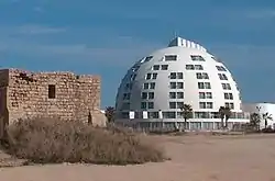 A domed structure housing the 13th-century tomb of Sheikh Awad sits atop a hill overlooking Ashkelon's northern beaches.[49]
