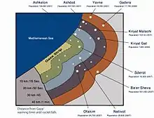 Ashkelon or Ashqelon (/ˈæʃkəlɒn/ ASH-kə-lon; Hebrew: אַשְׁקְלוֹן, romanized: ʾAšqəlōn, IPA: [aʃkeˈlon] ⓘ; Arabic: عَسْقَلَان, romanized: ʿAsqalān) is a coastal city in the Southern District of Israel on the Mediterranean coast, 50 kilometres (30 mi) south of Tel Aviv, and 13 kilometres (8 mi) north of the border with the Gaza Strip.